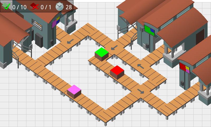 Conveyors is a game in which colored boxes should be delivered to multiple facilities. But, not every facility requires the same boxes. Therefore, you have to keep an eye on which box color is actually required at each facility and change directions of conveyors, such that everything gets to the right place. Sounds easy? Try it under time pressure with lots of boxes floating around.