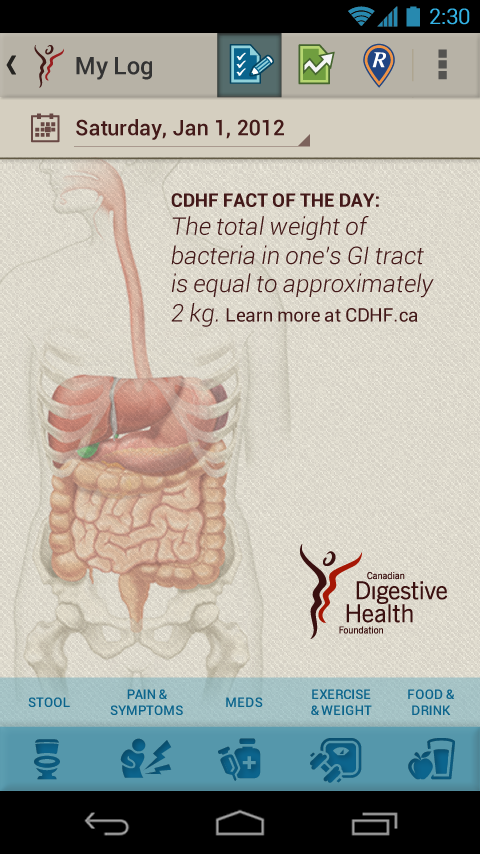 The more health information you provide to your physician, the better care you will receive. Gi BodyGuard, developed by experts at the Canadian Digestive Health Foundation (www.CDHF.ca), is a free, easy to use app that allows you to track information about your health, symptoms, medications, food and exercise. Who uses Gi BodyGuard? Gi BodyGuard caters to people with a multitude of digestive health issues including IBS, IBD (Crohns and Ulcerative Colitis), Celiac Disease, Lactose Intolerance, GERD, Acid Reflux, Diarrhea and Constipation, among others. What can Gi BodyGuard do for me? Gi BodyGuard empowers you to track vital health information. With a few quick clicks, you can quickly, easily and privately create an extensive, up-to-the-minute summary of your digestive health history to share with your health care team. Armed with critical information about you, they can recognize trends that may indicate a change in your health status, make the best diagnosis, and provide informed care to help you feel better. Use Gi BodyGuard to track: • Stool frequency and consistency • Presence and type of blood in stool • Symptoms you experience • Pain location and severity • Medications • Your medical history • Food and liquids intake • Exercise (cardio, strength training and stretching) • Weight Gi BodyGuard also allows you to set reminders for taking medications and renewing your prescriptions. Whether you are dealing with a short term or chronic illness, these are important for regaining and maintaining your good health. ABOUT THE CDHF The Canadian Digestive Health Foundation (CDHF) helps reduce suffering and improve quality of life by empowering people like you with trusted, up to date, science-based information about digestive health and disease. As the Foundation of the Canadian Association of Gastroenterology, we work directly with leading physicians, scientists, and other health care professionals to help you understand and take control of your digestive health with confidence and optimism. In addition to developing Gi BodyGuard, the foundation offers a robust suite of educational information, programs and events to those looking to improve their digestive — and overall — health. You can learn more at www.CDHF.ca.