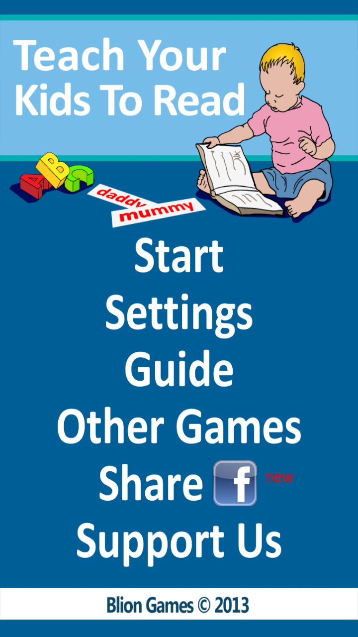 Teach Your Kids To Read is a useful tool for those who are applying the method for early reading, created by Glenn Doman, but also for those who simply want to share the reading of new words with the children. You’ll let your child see some virtual flashcards, following the steps of the same method. For a complete and official description and application of the method refer to the Glenn Doman’s book “Teach your Baby to Read”. Learning to read English will be easy and fun. Something to do with your child that will help him grows and discovers new things. Teaching how to read is the best way to start the child to a deeper and faster education. Improve your children QI! Read from an early age also improves verbal and relationship skills. Reading is like learning to speak. The Alphabet (ABC) is available in uppercase and lowercase. You can teach the words already contained in the app or add new ones to create the first book to read with your child. Once your child will be able to read the English words, you can use the same app to let him learn how to read another language (Spanish, English, French) by adding new words and modifying the existing ones. The best app available for reading! Mummy, Daddy One by one, you’ll teach the first two words: mummy and daddy. The red color support to recognize the words. Clicking on the microphone icon it will be possible to record the pronunciation of the word using your own voice. The audio will be played when the word is shown or touching the screen. Me – Around Me You’ll teach the words belonging to the child himself/herself and the ones of the environment around him/her. The size of the font is barely smaller. You’re able to add new words and delete old ones. It’s also possible to record the pronunciation of the word using your own voice. My First Book You’ll be able to add and see single pages of the book that will be completed in the next step. A Real Book Starting on the pages created in the previous step, you’ll see the pages of the book in a smaller size. Now the kid can try t read the whole page which is composed by every sentence taught separately in the last step. Alphabet You’ll show the alphabet in capital and lower case letters. Quick Word A rapid way to write a word and let the child read. From the main menu you can decide the color of the word (red/black).